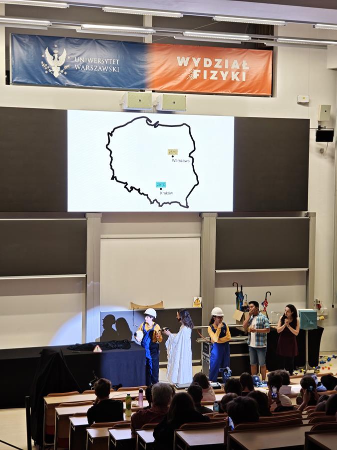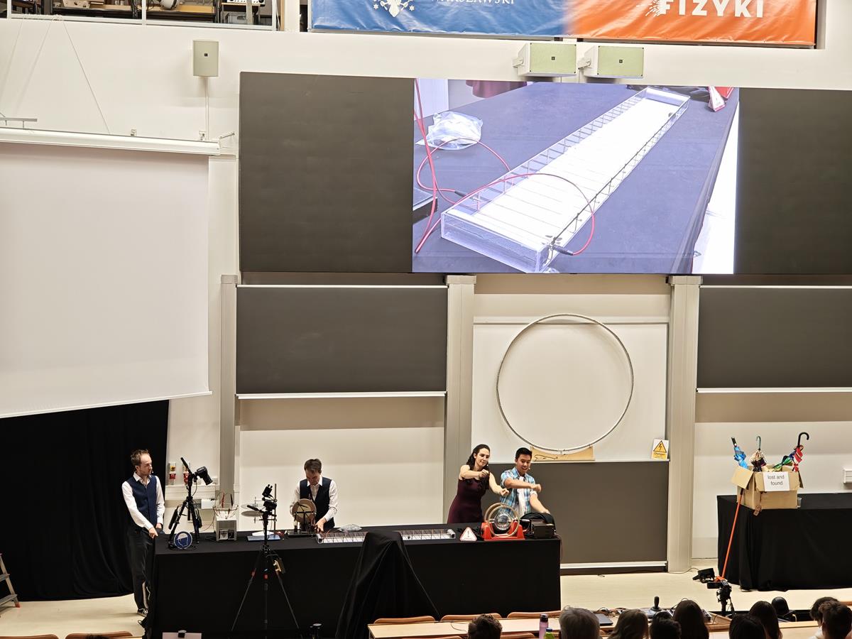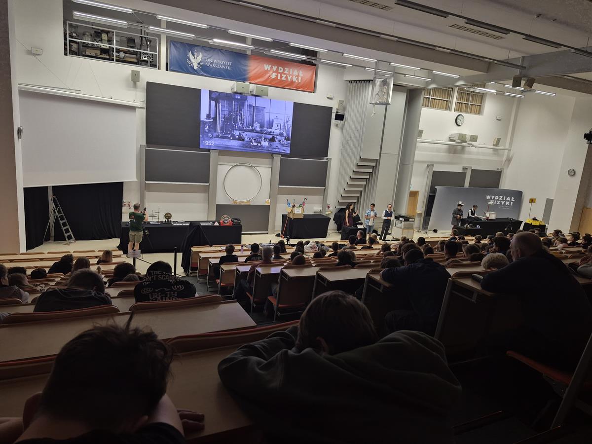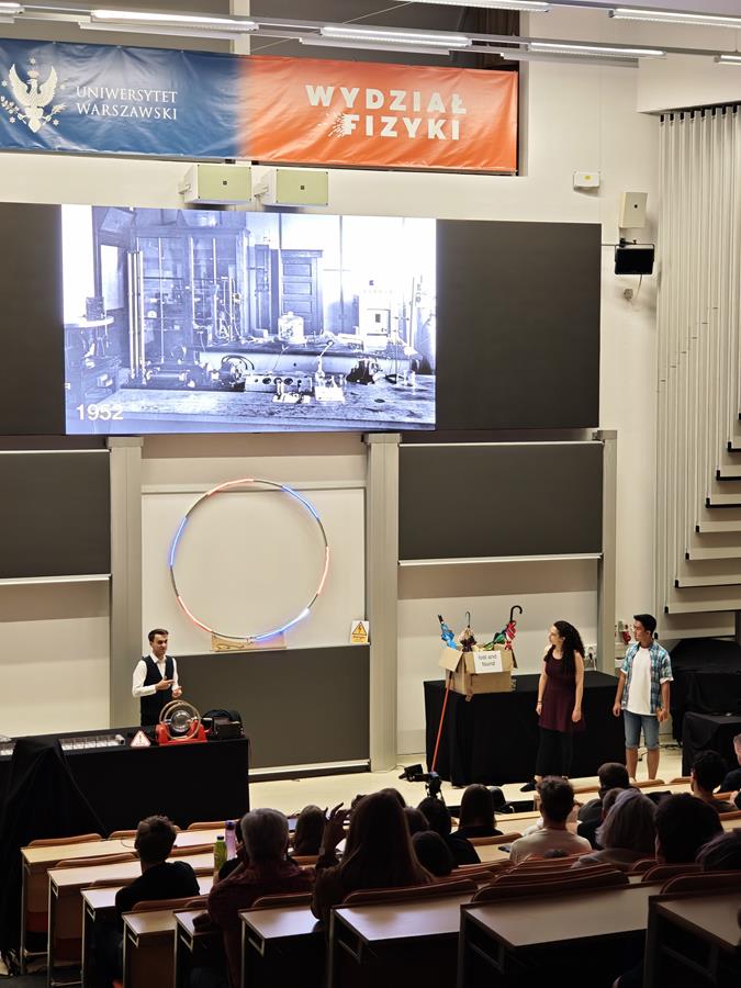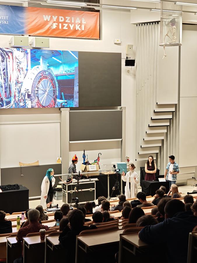 Wtorek, 23 września, upłynął naszym uczniom z klas pierwszych liceum pod znakiem ekscytującego „Physics Show” na Uniwersytecie Warszawskim! To nie było zwykłe doświadczenie – spektakl prowadzony w formie teatralnej przez dynamiczną grupę studentów z Niemiec dosłownie ożywił fizykę! Dzięki ich energicznemu występowi, pełnemu zaskakujących eksperymentów i świetnego humoru, młodzież mogła w niezwykle przystępny sposób zrozumieć proste, a jednak fundamentalne zagadnienia z fizyki. Była to inspirująca lekcja, która pokazała, że nauka potrafi być fascynująca i widowiskowa!